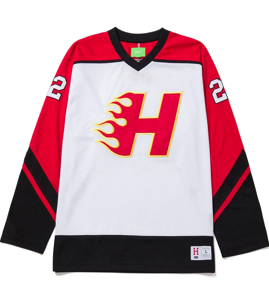 The Enforcer Hockey Jersey is made of color-blocked mesh paneling and features vintage hockey-inspired artwork in tackle twill patches at the chest, back, and sleeves. Topped with a rib-knit collar, the jersey is finished with a retro-sportswear HUF locker label at the left hem.