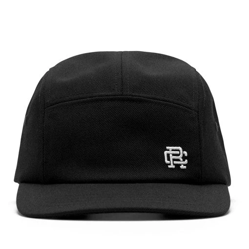 This twill 5-panel cap features contrast monogram logo embroidery at the front. Designed with a curved brim, adjustable webbing strap closure, and woven eyelets.