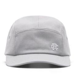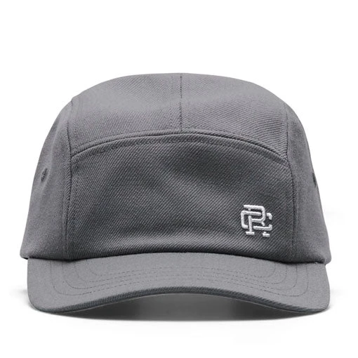 This twill 5-panel cap features contrast monogram logo embroidery at the front. Designed with a curved brim, adjustable webbing strap closure, and woven eyelets.